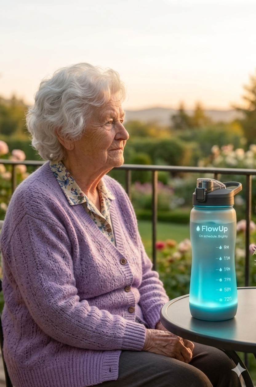 FlowUp es una botella inteligente diseñada para ayudar a las personas mayores a mantenerse hidratadas de forma autónoma y segura. Con la edad, muchas personas pierden la sensación de sed, lo que puede provocar problemas de salud como mareos, confusión o incluso ingresos hospitalarios.